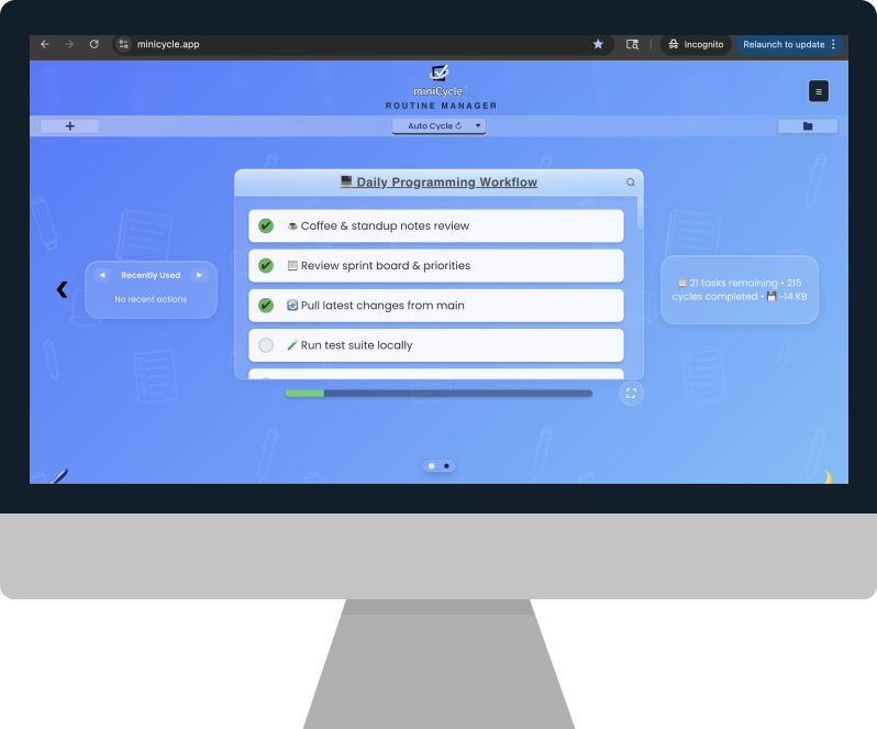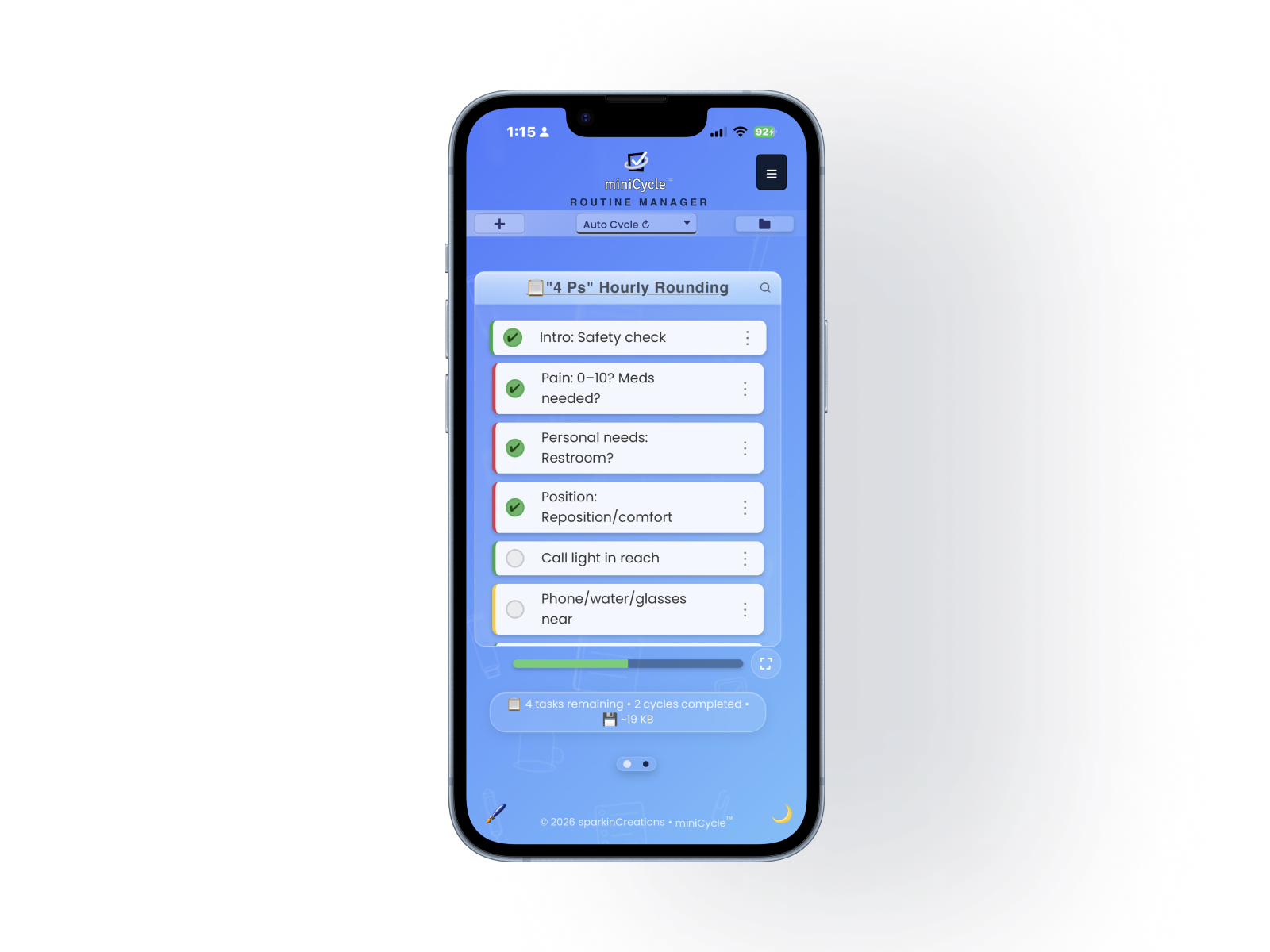From shift rounds to morning rituals — build your routine once, and miniCycle resets it every time you finish.